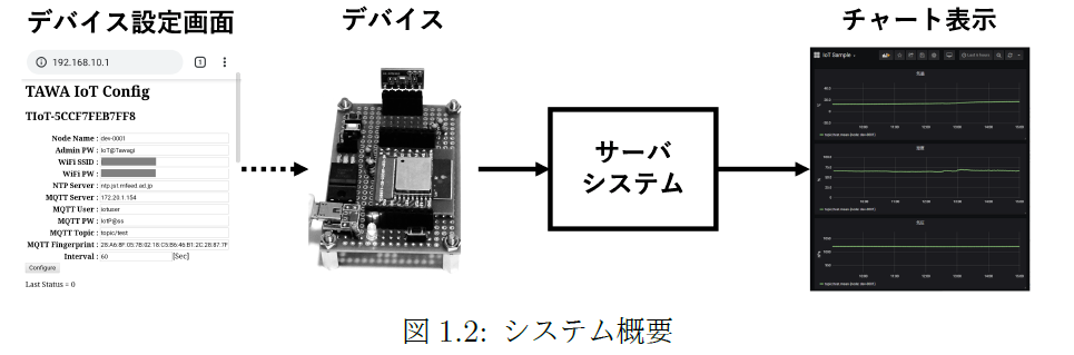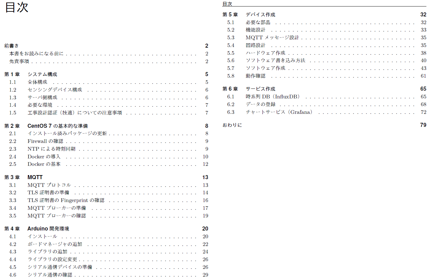 環境を観測しサーバへ送信するデバイスと、システムとして動作させるために必要になるサーバサイド環境の構築について取り扱い、本書のみで観測から蓄積・表示までのIoT シス テムを構成できる内容としています。